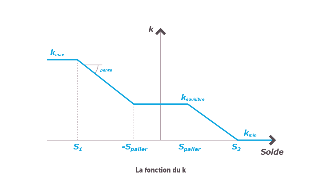 Taking another example, if it is found at the end of September that the cumulative balance for the period up to August is greater than the value Spalier (and less than the value S2), then the applicable value of the coefficient "k" for the month of December will be equal to keq-p*(Solde - Spalier).